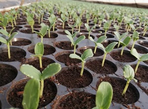 可采用打孔穴播,穴距视品种的熟性,整枝方法而定,一般距0.4-0.45m定。播种深度以土壤质地和土壤湿度的不同而定,土壤沙性大,墒情不足,可适当播深,覆土稍厚;土质粘重,墒情较好,播种浅,覆土薄,一般播种深度3-4cm,每穴播种2-3粒种子。行距0.8m,株距0.4-0.45m,采 用“品”字形方式播种。栽培蜜度800-880株/亩。 查苗补种。一般播种后4-5天即可出苗,出苗3天之内应力即查苗补种。补种的种子应进行种子消毒,然后浸种催芽,种子露白即可播种。 间苗,定苗。2片真叶时开始间苗,每穴留2株,间苗时注意间去弱苗及病苗。4-5片真叶时定苗(7月底),每穴留1株健苗。如果精量播种,可在4片真叶时,将间苗,定苗一次完成。 |